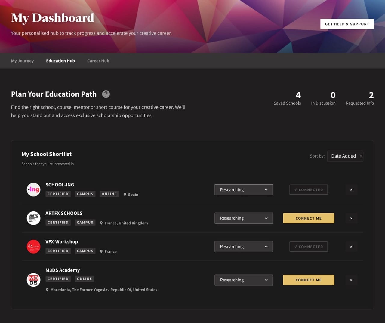 The Education Hub is where you plan, track, and manage your creative education journey - from early research through to direct conversations with schools.